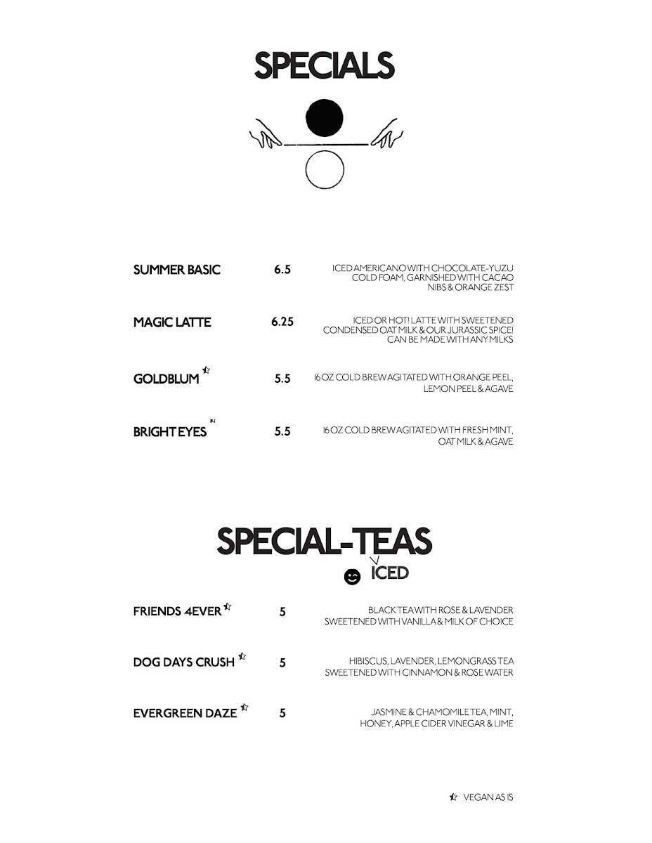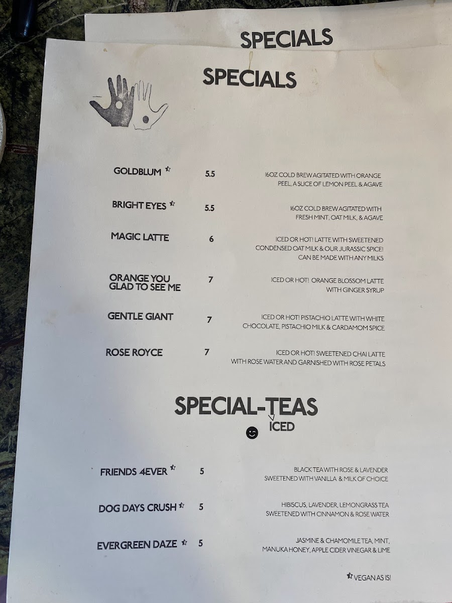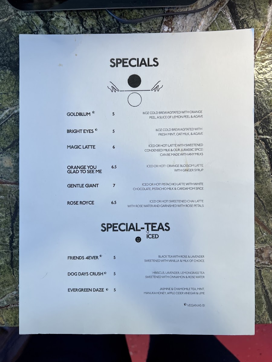 - Cold Brew Specials: Try the vibrant Bright Eyes or the playful Goldblum, each for $6.00.